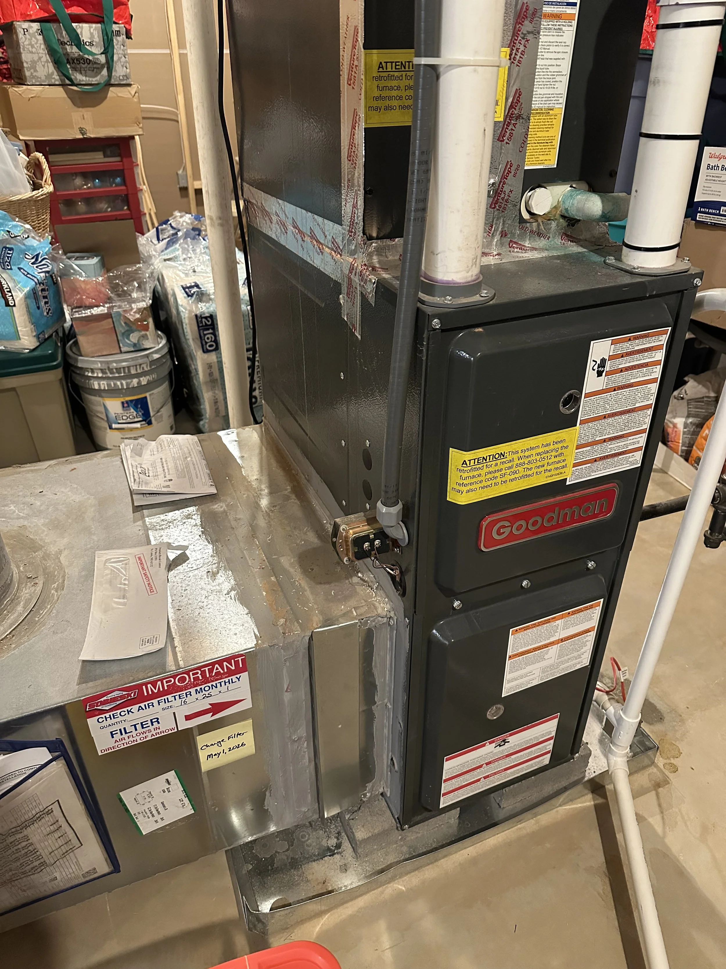 A homeowner tapes a reminder to replace his filter on the heating duct.